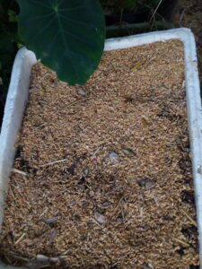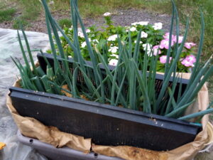 中: 葱が伸びて来たので、苗のトレーと米袋で高さを増しました。