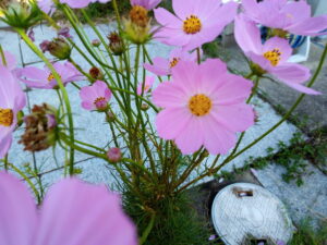 全部西隣さんの植物です。柿も順調です。コスモスも今がピークかしらね。二株ばかりある白コスモスが良いアクセント。