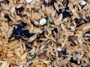 キンギョソウの発芽です。左からピンク、赤、黄色。