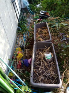 ちゃーちゃんが来ました。第二堆肥枠に案内しようとすると『あっ、分かっています。』、とするすると上って食べ始めました。笑 あまりここでちゃーちゃんに食べさせる癖をつけたくなかったんだけどなぁ。まぁ、良いか!?帰り道、ゴーヤなどのプランター二つを少し外側にずらし、行灯を保管する場所を作ります。この場所は下に雨水管が通っていて土があまり深く使えないので、地植えはしたくないのです。