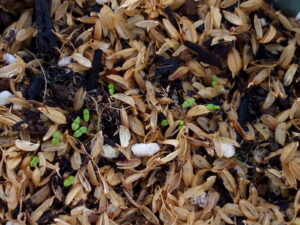 キンギョソウの発芽です。左からピンク、赤、黄色。