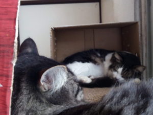 東京から持って来た食器棚の上に倒れるのを防ぐために7年前に簡単な棚を設置しました。落ちた時が怖いので、重いもの、ガラスや陶器などの壊れ物は入れずに普段使わない用品を入れていましたが、最近、猫たちが氣になって興味ありそうな顔をしていたので、荷物を寄せて場所を作りました。毎日、トラ子や福が入っています。