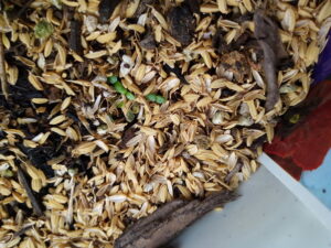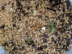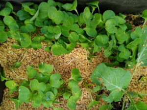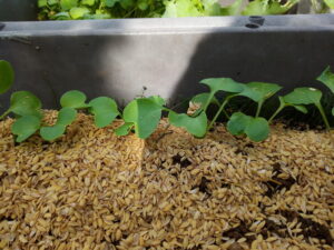 大根の軸が伸びて来たので、赤玉小粒ともみ殻で土寄せ代わりにしました。運ぶ時はもみ殻をしっかり詰めて運ばないと軸が折れますね。