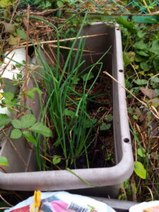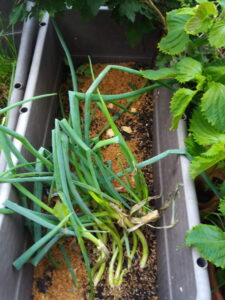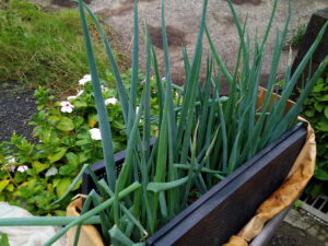 右: 播種から育てたものと、再生長葱のミックスプランターです。葱はいろいろ試して見て施肥管理しやすいプランターが私の性格に合っていますね。まとめて育てられるのはとてもやり易いです。このやり易さがないと長続きしません。昨年は庭に植えたら、あちこちに植えたので施肥が面倒くさくなりました。