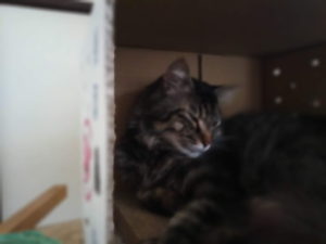 昨夜はうめとトラ子が近くで寝て呉れました。臭いがオス猫臭い!、と言われたタイガーさんは私の洗い立ての布団マットの上で寝ていた~!うめだってタイガーさんの寝た跡は嫌だっていう位、臭いが強い。福は何故か一階の玄米の箱の上!?夜中にうめが表に行って、そのあと福とトラ子が行ったんだっけ?最近はタイガーさんが夜中に出かけずに落ち着いています。