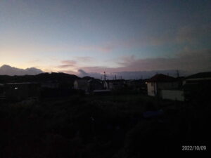 右: 海上の雲がきれいです。昨日の夜空は大きく分断し、真上が晴天、東の水平線の方は雲があり、その合間から真丸に近くなってきた月が覗いていました。今弱雨が来て日付が変わる頃に”雨”となり、明日の朝5-6時頃には強雨があるようです。それが数日前の鱗雲だったのでしょうかね。