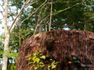 中: Iさんの林で大木が二本伐採されました。明るくなってキョンも住みにくくなったでしょうね。直径が根元では軽く1mを超えます。