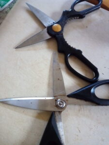 真っ赤に錆びた道具は20時間位取ると新品を上回る美しさになる、という動画が良くYouTubeに上がっています。この鋏はどちらも恐らく中国製のものなので、金属の質はあまり多くを望めませんが、形が変わるまで研いだら使い勝手がいいものが出来るかも知れませんね。笑