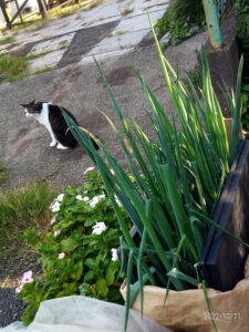 右: 葱と日日草の向こうに甘えん坊の福が写っています。笑