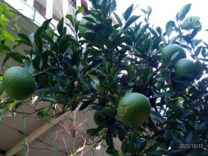 中: 台所に一番近い枝には夏蜜柑が9-10個着いています。手前の二つは私の握りこぶし位で、右上のものは野球ボール位です。