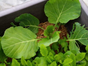 いずれにせよ、庭と玄関アプローチの二か所に分けていたことが今回は幸いしました。仔猫に乗られた大根、キャベツ、カリフラワーは復帰まで時間が掛かるでしょう。玄関アプローチの大根は本葉が二枚になりました。庭の仔猫に乗られたプランターの野菜さん達も元気に復活してくれました。今日は混合液肥で施肥をしましょう。