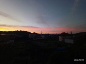 今朝の朝焼けです。左と中が東ー東南東、右が南ー南東です。朝焼けは雨かも。