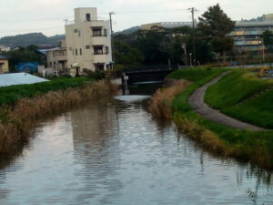 左: 満潮に強い南風が加わり、いつもにない増水状態の昨日の清水川。