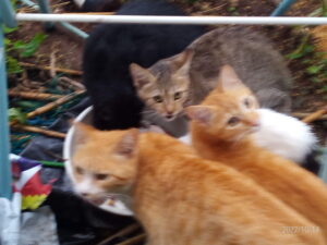 ちゃーちゃんのご飯でお相伴に預かる仔猫達。ちゃーちゃんとの関係は多分お祖母ちゃんと孫たち。白黒仔猫を除いてね。