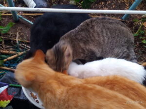 ここ何回か、皆でご飯を奨励しています。ガーガーいがみ合うんじゃなくて、お腹が空いた者同士、美味しく食べよう、をモットーに大皿で食べています。三毛ちゃんだけが1時間以上遅れて来るので、そこでご相伴にあやかる仔もいるのですが。笑