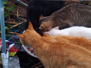 内猫さんのカリカリを用意して、外猫さんにご飯の支度をして、これから私のご飯の支度です。外猫さんに沸騰したお湯をサッとかけたキャベツは私のおかずと共通です。笑 『今日は草が沢山入っているな。』『文句言わずに食べろ!』な~んて会話があったのかな。ちゃーちゃんが一緒に食べているから白黒猫(雄)が来ても大丈夫。福とかトラ子とか取っ組み合いする位の小母ちゃん猫だから、大阪の小母ちゃん並みに強い。