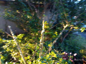 中: ぶれています。すみません。槿の木全景で、緑色の葉は白躑躅の葉です。槿の落葉はもう少し後になります。槿の主枝は亜主枝も入れて4-5本です。今年はきっちり仕事をします。