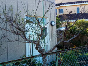実梅の木はまず長すぎるところを15-30㎝にして行きました。但し幹中央に近い処の垂直枝は将来の実を取る枝として60㎝以上で残してあります。2時間くらい作業をして来ましたが、そこから深々と冷えて来ます。西隣さんの方へ出ている枝はぎりぎりで落としました。玄関前に横に広がった枝の内、下の一本は来年結実を収穫した後に切り落とします。実が沢山着く枝でかなり思い入れが深いのですが、実が太って来ると背の低い私でも顔の真ん中辺まで枝が下がり、通行の邪魔でもあるので切る事になります。