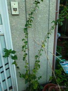 うちの庭から椿に掛かっている藪枯らしとカナムグラを引っ張りましたが、びくともしない。びくともしないだけでなく、椿の立ち枝を切れないので、お隣の畑に入れて貰ってカナムグラと藪枯らしを引っ張って鋸を振るって切り刻み一本枝を切って、家に戻りました。今度は家の側から立枝を切り落として行きます。少し明るくなりました。後数本の立ち枝が残っているところで小休止。軍手をしていても手の甲がチクチクしますね。カナムグラのせいです。