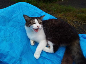 外猫さん達の缶詰を買って来たら、丁度、食事の時間でちゃーちゃんが催促に来ていました。