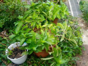 右: Iさんのお宅から分けて頂いた紫陽花の挿し穂、大きいのが今年初めて花を着けて呉れた紫陽花。その挿し穂が二鉢。その向こうに西隣さんから頂いた紫陽花苗があります。ここは東の光も当たりますが、弱く、西の光も木漏れ日なのできっと紫陽花の場所としては適当なのかな。