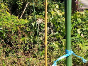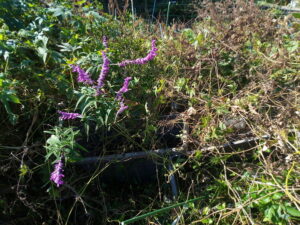 Iさんから頂いたサルビアレウカンサメキシカーナです。酷い藪の中でも咲いてくれました。これは藪を払った後、我が家の外壁の所へ移動します。藪は最終的には伐採した樹の辺りまで払わないと安心できないですね。