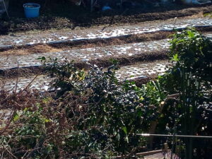 昨日定植した脇の通路の大蒜です。午前中いっぱい日が当たります。もみ殻をしっかり足してあげよう。