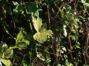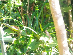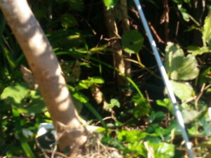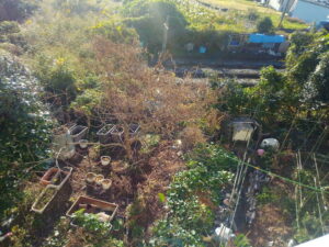 奥に見えるのはカイヅカイブキの陰で分からない内に発芽した木です。近々、鋸で切り落とします。手前の太い木は椿です。
