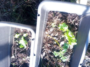 左: 一昨日蒔いたリーフレタスが発芽です。中&右: 猫のサンルームの前の大根。お日様の力は偉大です。