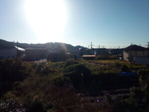 かなり陽が昇ってからの写真です。7時52分。右: 庭を取る角度がまだ決まっていない。😅