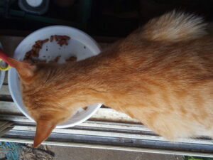 12時過ぎ、三毛ちゃんが大遅刻でやって来ました。『家は10時過ぎだよ。次は16時過ぎだからね。』幸い取ってあったものを渡し食べて貰いました。今、ちゃーちゃんがそのお皿に残ったものを食べていてひっくり返してしまいました。私を見つめて『どうにかしてよ。』、と言っています。自分でやりなさい。