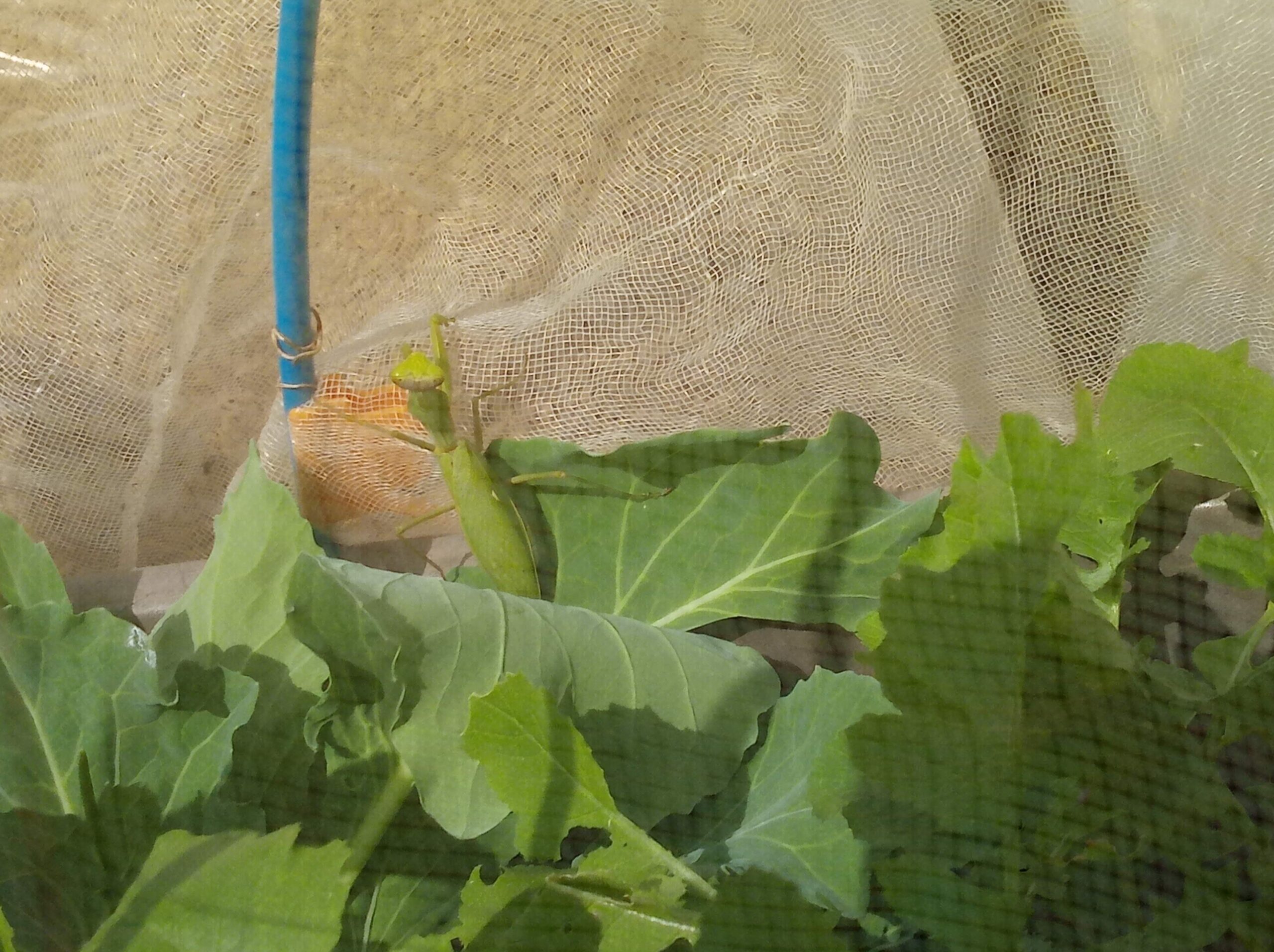 カマキリさんを見つけたので、玄関アプローチの大根さん達が紋白のお子さんに食べられていた処で、管理人をお願いしました。今朝も同じ処に居ました。