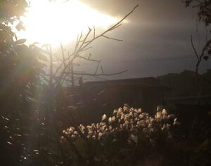 右: 一階から撮った山の上に上がって来た太陽。