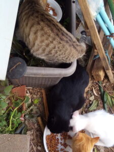 中: 私は猫の掘立小屋のストーカーみたいなものです。クロスケとはっちゃんは仲良しですが、八ちゃんは少し触れるようになりましたが、クロスケは全然です。まぁ、ゴロゴロ言ってくれるのは大人猫と曲がり君だけです。