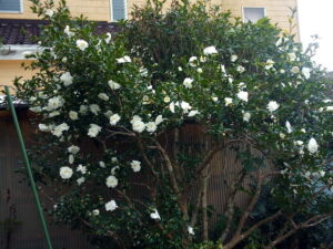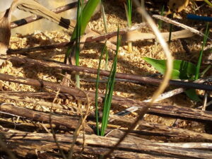 中: 東の椿の根元ではカラーが芽を出しました。これで三か所、そろい踏みです。