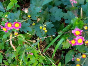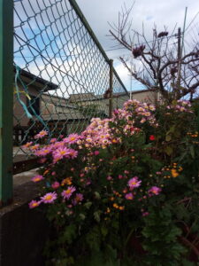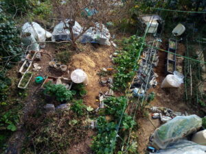 右: サツマイモの蔓を支柱に括り付けたので、通路が通れるようになりました。コンポスターの前に悪戯坊主のはっちゃんが居ます。