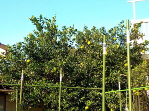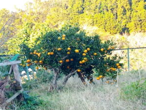 右: 我が家の夏蜜柑です。見えている東側だけで30個余りなので、ザッと見て60個かな。根元の刈草やもみ殻は効果があるんじゃないかしら。