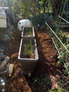 中: 1畝の通路に土留めを兼ねてプランターを置いてみました。う~ん、もう5㎝右(西側)に動かした方が良いかなぁ。