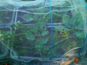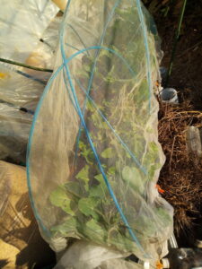 右: 同じタイプのものを庭に運んで朝日を浴びさせて育てました。玄関アプローチの方はモンシロチョウの虫害がありましたが、こちらは最初からネットに入っていますので、仔猫に潰された事以外は順調に育っています。朝の光がとても大切なんですね。後ろの掘立小屋では曲がり君とはっちゃんがレスリング中です。