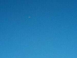 西の山の上を航空機が飛んでいます。4.0倍で撮ってみました。奇跡的にクリアです。笑
