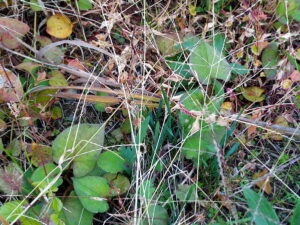 中&右: 去年植えた水仙の場所5か所覚えていますか?もう発芽していますよ。コスモスを刈る時、注意して下さいね。