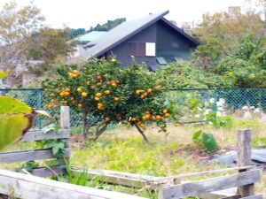 左: 西隣さんの温州さんは下の方の実がゆらゆら風に揺れていました。