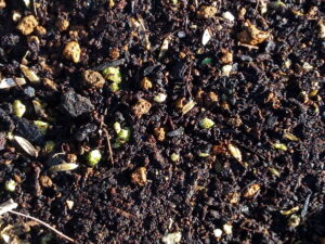 左: キンギョソウのプランターに何やら発芽!緑色に光るものが。