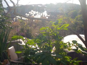 右: ジャガイモの茎が随分のびたでしょう?プランターですが、土の表面化r見たら60㎝は軽く超えています。グランドペチカです。今日は生ごみバケツを洗った液を上げました。向こうに見えている呆けた逆光の薄が綺麗です。