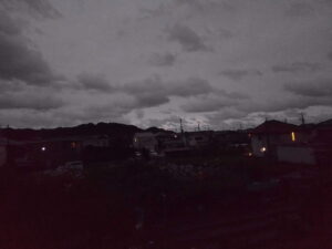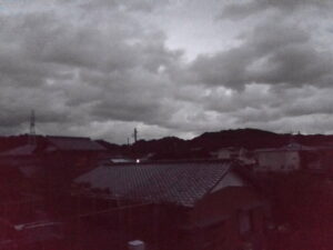 西の山の向こうで雷の音がしています。半島の真ん中をザーザーぶりの雨雲が北東へ進んでいるようです。
