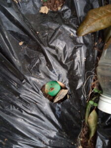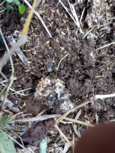 右: 夏前に撒いたもみ殻に菌糸が回って理想的な状態に。そっと土の中にもdして置きました。