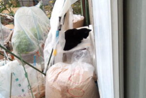 発泡スチロールの箱を接着剤で付けて冬用の巣箱を用意しました。クロスケが来ました。あ、あ、天井に乗ったら壊れるよ~!それは考えていなかった。防水はビニール袋で包んだから大丈夫だけど、😸達の重みは忘れていた~!