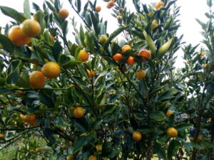 西隣さんの金柑が我が家の物干しから見ても色づいて来ているのがはっきり分かりました。アップした写真ではもう食べられるんじゃないの?、というくらいの色付きです。