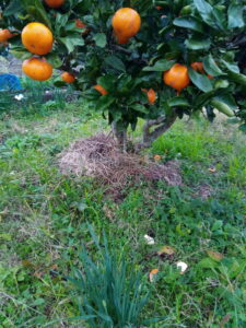西隣さんの蚕豆畝です。但し、途中のフープまでね。温州さんの根回りでは可愛い水仙がもうじき咲きます。