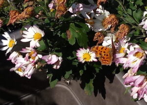 枯れかけた菊にタテハチョウがやってきてくれました。